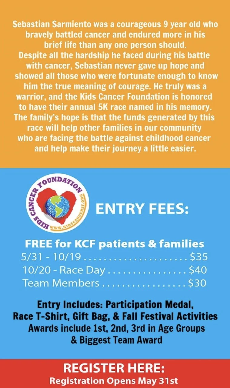 This year the Kids Cancer Foundation 5K Walk/Run in Memory of Sebastian & Fall Festival will take place again at
