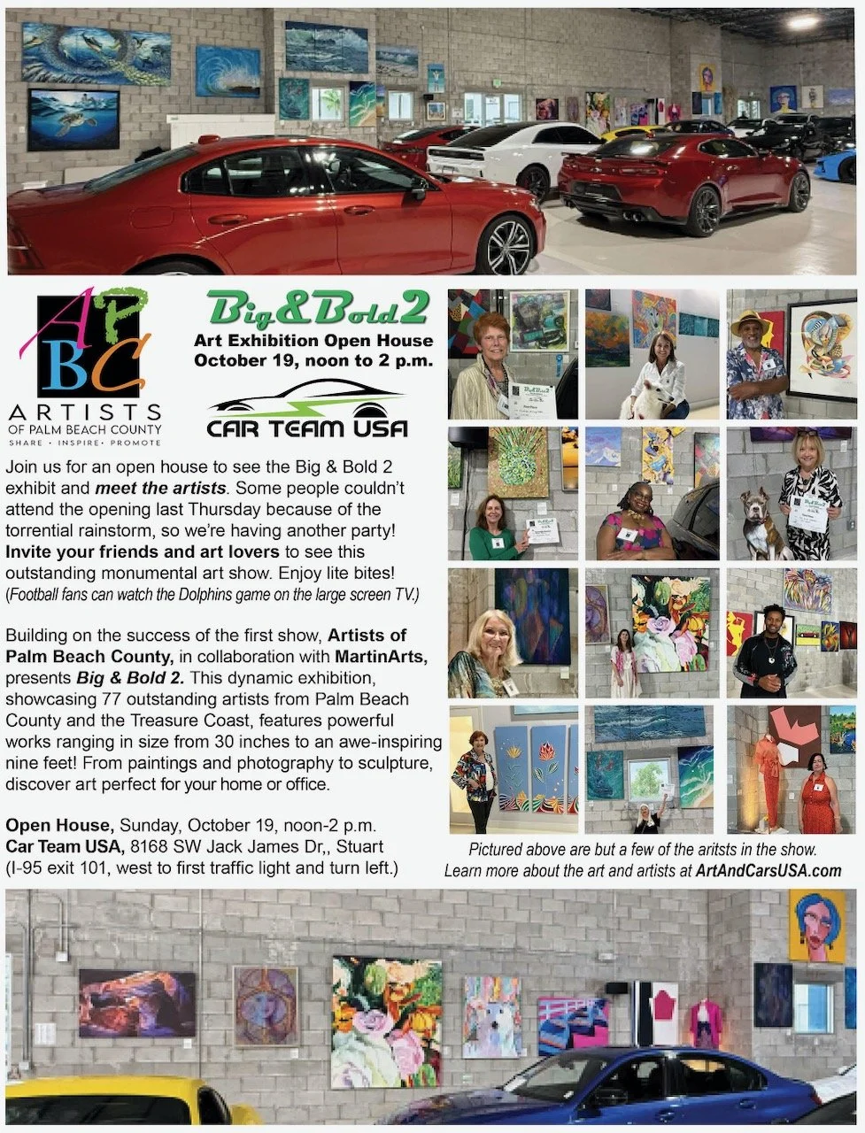 Big & Bold 2 - ART EXHIBITION OPEN HOUSE - by Artists of Palm Beach County Sunday, October 19, 2025 12:00 PM 2:00 PM Car Team USA 8168 Southwest Jack James Drive Stuart, FL, 34997 United States (map) Google Calendar ICS