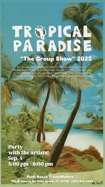 Reception - Tropical Paradise - Palm Beach FrameMakers - Participating artists include WAS members Ayesha DeLorenzo and Garrett Jay Thursday, September 4, 2025 5:00 PM 8:00 PM Palm Beach FrameMakers 183 North County Road Palm Beach, FL, 33480 United States (map) Google Calendar ICS